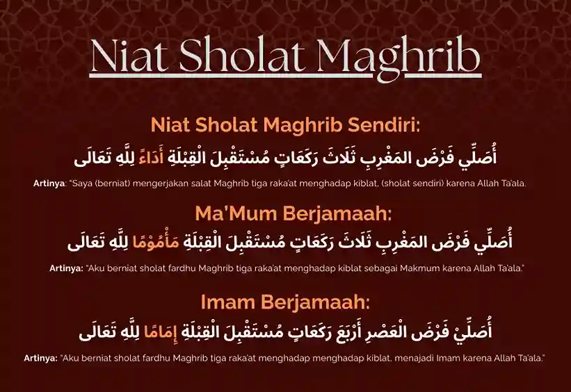 Latin: Ushalli fardho maghribi tsalaatsa raka’aatin mustaqbilal qiblati makmuman lillaahi ta’aala.
